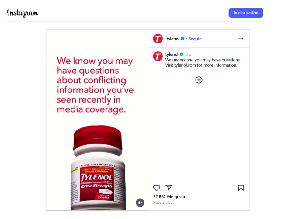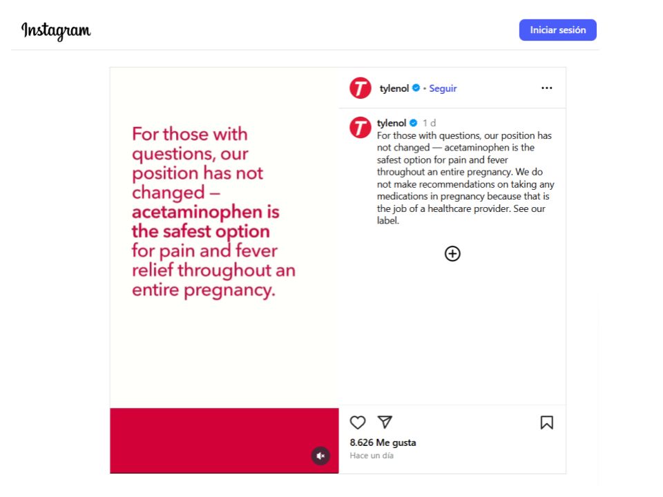 En contraste, en su cuenta de Instagram sí siguen publicando a septiembre de 2025. Un post del 24 de septiembre de 2025 dice: “Para aquellos que tienen preguntas, nuestra posición no ha cambiado: el acetaminofén es la opción más segura para el dolor y la fiebre durante todo el embarazo. No hacemos recomendaciones sobre tomar medicamentos durante el embarazo, porque ese es el trabajo de un proveedor de atención médica”.