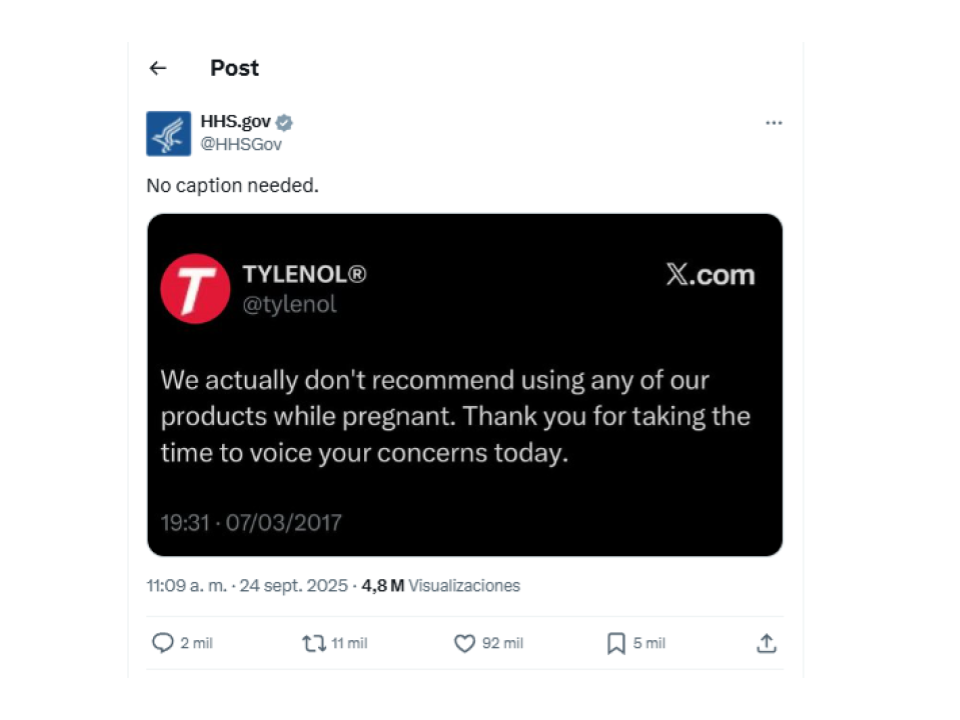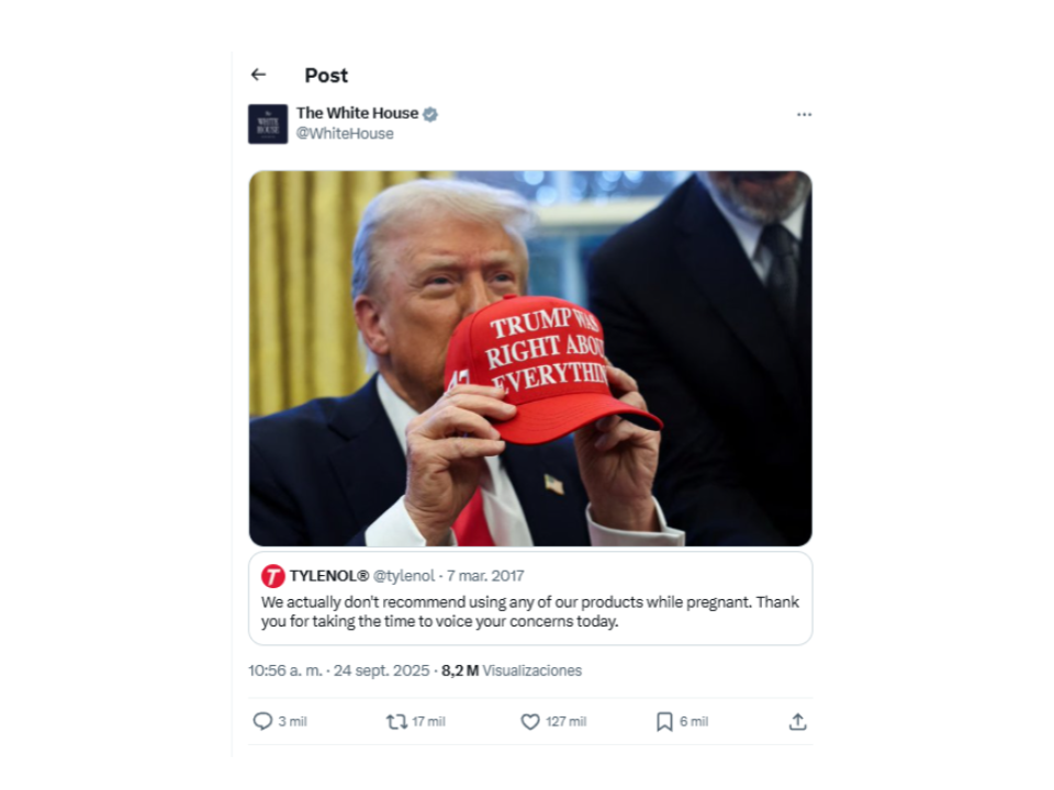 Desde la cuenta en X (antes Twitter) de la Casa Blanca, una foto del presidente Donald Trump sosteniendo una gorra roja del movimiento Make America Great Again (MAGA) fue retuiteada este 24 de septiembre de 2025 con el posteo de Tylenol del 7 de marzo de 2017. El Departamento de Salud y Servicios Humanos (HHS, por sus siglas en inglés) hizo lo mismo con esa publicación, de hace ocho años, añadiendo la frase “no se necesita pie de foto”.