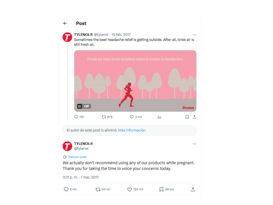 Recircula un posteo de Tylenol (uno de los nombres comerciales del analgésico paracetamol o acetaminofén) de hace ocho años en el que escribieron: “realmente no recomendamos usar ninguno de nuestros productos durante el embarazo. Gracias por tomarte el tiempo para expresar hoy tus preocupaciones” en respuesta a una publicación eliminada ya, de la que no se puede saber a qué se refería.