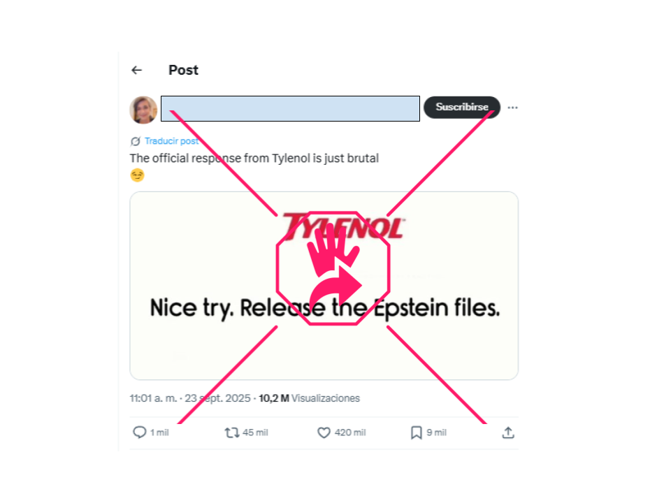 Un posteo viralizado en X, con más de 10.2 millones de visualizaciones, dice: la respuesta de Tylenol es brutal, junto a una imagen en la que se ve el sello de la marca, y la frase en inglés: “Buen intento. Publica los archivos Epstein”. Esa no es una publicación verídica. No hallamos ninguna respuesta con esas características en los canales y medios oficiales de Tylenol .