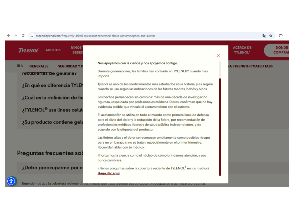 Un comunicado en la web de Tylenolseñala que se apoya en la ciencia y en los consumidores. “Durante generaciones, las familias han confiado en TYLENOL® cuando más importa. Tylenol es uno de los medicamentos más estudiados en la historia, y es seguro cuando se usa según las indicaciones de las futuras madres, bebés y niños. Los hechos permanecen sin cambios: más de una década de investigación rigurosa, respaldada por profesionales médicos líderes, confirman que no hay evidencia creíble que vincule el acetaminofeno con el autismo”.